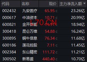 个股方面,九安医疗获得逾23亿元主力资金净流入,中油资本获得逾20亿元净流入,金开新能、昆仑万维(维权)、铜牛信息、莲花控股等7股也获得超10亿元净流入。