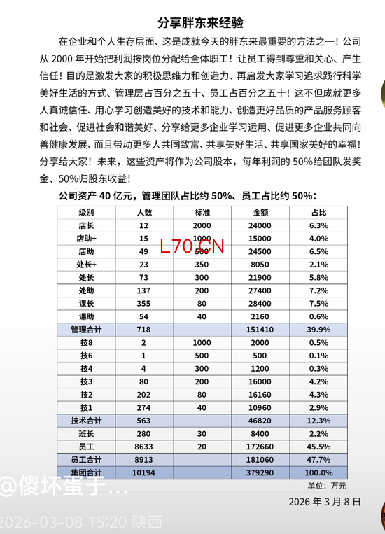 3月8日,于东来公布胖东来40亿元资产利润的分配标准:管理团队占比约50%,员工占比约50%。未来,这些资产将作为公司股本,每年利润的50%给团队发奖金、50%归股东收益。