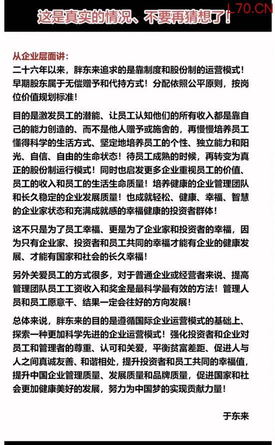 于东来称,这么做不只是为了员工幸福,更是为了企业家和投资者的幸福,因为只有企业家、投资者和员工共同的幸福才能有企业的健康发展。