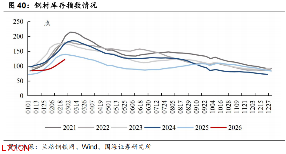 本周钢材库存指数环比上升:截至3月4日,本周兰格钢材库存指数(综合)为139.9点,周环比上升17.9点。