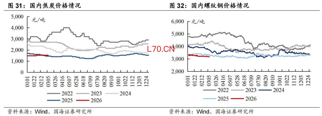 炼焦煤和焦炭来看,对于炼焦煤,本周样本煤矿产能利用率周环比+13.46pct至84.6%,主要系春节后陆续复工复产。蒙煤方面,本周持续高位运行,3月2日-3月5日甘其毛都口岸通关4天,日均通关1405车,较上周同期环比增加74车。需求端,本周铁水产量周环比-5.81 万吨至227.52万吨。库存端,下游焦企多数消耗厂内库存,以刚需采购为主。本周焦煤生产企业库存相较周环比+14.51 万吨。整体来看,供给端,节后国内煤矿陆续复产、蒙煤通关车数迅速提升。需求端,两会限产下铁水周环比下滑,焦化厂维持原料消耗。供需阶段性宽松,焦煤矿山库存环比小幅累积,截至3月6日,港口主焦煤价格1,580.00元/吨(周环比-80.00 元/吨)。后续关注铁水产量、进口及国内煤矿复产表现,原油扰动下动力煤价格淡季表现以及保供产能政策后续情况。对于焦炭,供给端,由于两会召开,部分企业开工受限,本周焦企产能利用率周环比-0.13pct至74.06%。需求端,本周铁水产量周环比-5.81 万吨至227.52万吨。库存端,两会影响下河北地区部分钢厂开始执行限产,本周独立焦化厂焦炭库存相较周环比上升。整体来看,本周开启首轮提降,并于3月6日正式落地,降幅为50-55元/吨,焦炭市场偏弱运行,后续关注两会期间钢焦生产变动以及上游煤价情况。