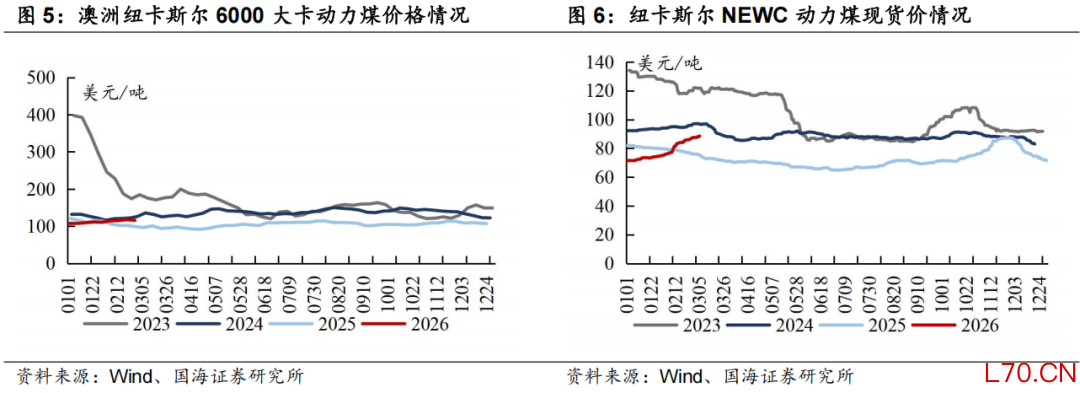 截至2月27日,国际6000大卡动力煤价格环比下降,本周国际5500大卡动力煤价格环比上升:截至2月27日,纽卡斯尔6000大卡动力煤价格为115.71美元/吨,周环比下降1.7美元/吨;截至3月5日,纽卡斯尔5500大卡动力煤(2#)价格为88.5美元/吨,周环比上升1.0美元/吨。