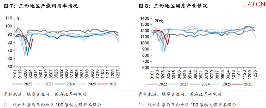 本周三西地区产能利用率、产量环比上升:截至3月4日,三西地区产能利用率为84.1%,周环比上升12.01pct,三西地区周度产量为1135.7万吨,周环比上升162万吨。