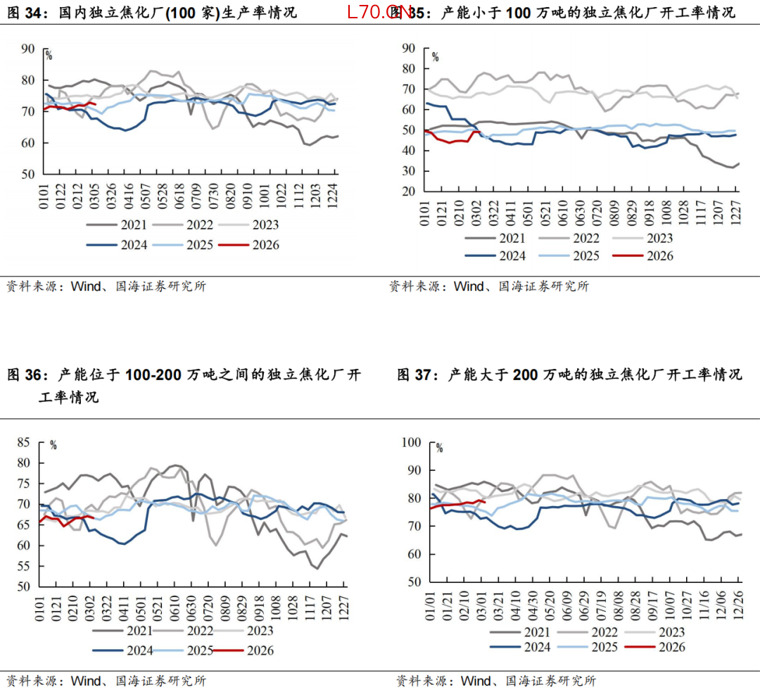 本周焦化厂生产率环比分化:截至3月6日,国内独立焦化厂(100家)焦炉生产率72.27%,周环比下降0.6个pct,产能小于100万吨的焦化企业(100家)开工率49.03%,环比持平,产能在100-200万吨的焦化企业(100家)开工率66.62%,环比下降0.5个pct,产能大于200万吨的焦化企业(100家)开工率78.5%,环比下降0.7个pct。