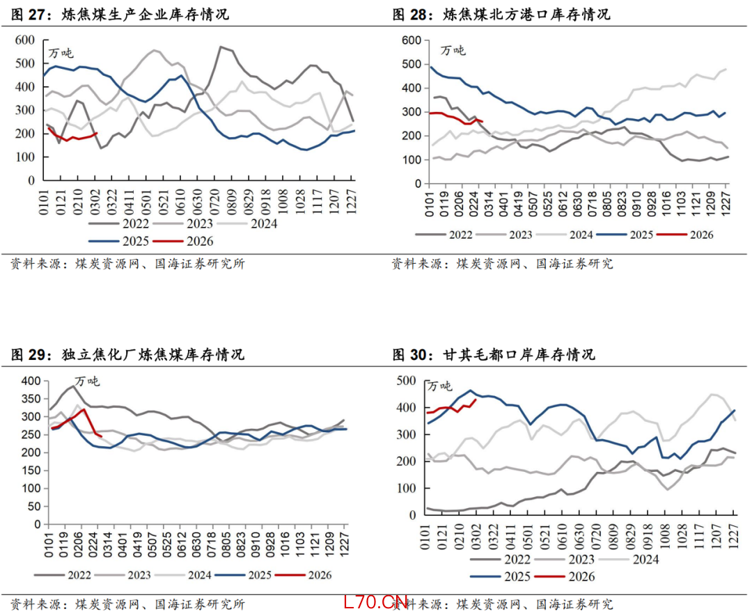 近期炼焦煤市场小结及展望:本周样本煤矿产能利用率周环比+13.46pct至84.6%,主要系春节后陆续复工复产。蒙煤方面,本周持续高位运行,3月2日-3月5日甘其毛都口岸通关4天,日均通关1405车,较上周同期环比增加74车。需求端,本周铁水产量周环比-5.81 万吨至227.52万吨。库存端,下游焦企多数消耗厂内库存,以刚需采购为主。本周焦煤生产企业库存相较周环比+14.51 万吨。整体来看,供给端,节后国内煤矿陆续复产、蒙煤通关车数迅速提升。需求端,两会限产下铁水周环比下滑,焦化厂维持原料消耗。供需阶段性宽松,焦煤矿山库存环比小幅累积,截至3月6日,港口主焦煤价格1,580.00元/吨(周环比-80.00 元/吨)。后续关注铁水产量、进口及国内煤矿复产表现,原油扰动下动力煤价格淡季表现以及保供产能政策后续情况。