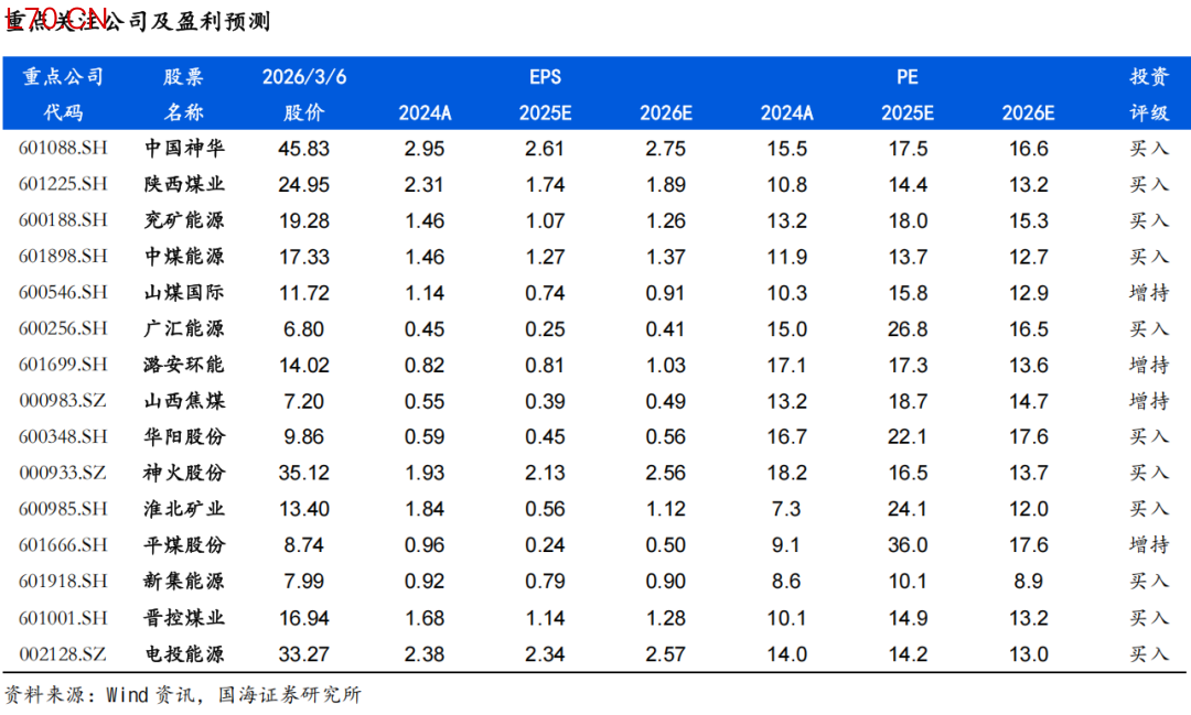 从大方向来看,煤炭开采行业供应端约束逻辑未变,需求端可能阶段性起伏波动,价格亦呈现一定震荡和动态再平衡。复盘行业30年经验,煤炭价格呈现震荡向上趋势,背后的驱动因素包括人工成本刚性上涨,安全投入、环保投入的持续加大,原材料动力等大宗商品涨价,以及地方政府加大征税力度等,从行业发展大趋势来看,上述驱动因素依然存在,煤价长期内仍然有上涨的诉求,过程可能是曲折的,但是方向应该是明确的。头部煤炭企业资产质量高,账上现金流充沛,呈现“高盈利、高现金流、高壁垒、高分红、高安全边际”五高特征。同时2025年起国家能源集团、山东能源集团、中国中煤能源集团、国家电投集团等多家煤炭央国企对旗下上市公司启动增持与资产注入计划,亦释放利好,彰显煤企发展信心、增厚企业成长性与稳定性。建议把握低位煤炭板块的价值属性,维持煤炭开采行业“推荐”评级。重点关注:(1)稳健型标的:中国神华、陕西煤业、中煤能源、电投能源、新集能源。(2)动力煤弹性较大标的:兖矿能源、晋控煤业、广汇能源、力量发展。(3)焦煤弹性较大标的:神火股份、淮北矿业、平煤股份、潞安环能、山西焦煤。