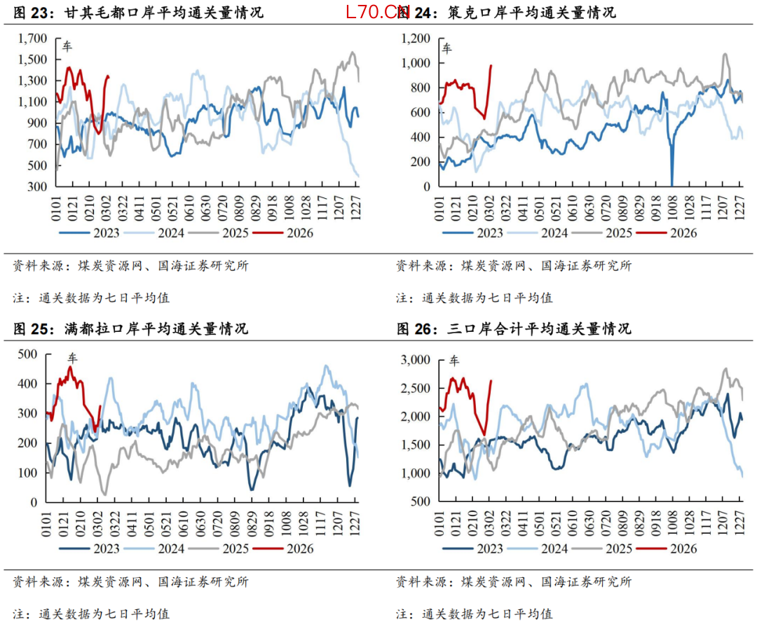 本周三口岸合计平均通关量环比上升:截至3月4日,三口岸平均通关量为2627车(七日平均值),周环比上升863车。