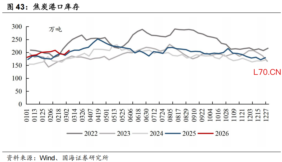 本周炼焦煤北方港口库存环比下降:截至3月6日,炼焦煤北方港口库存为259.15万吨,周环比下降8.4万吨。