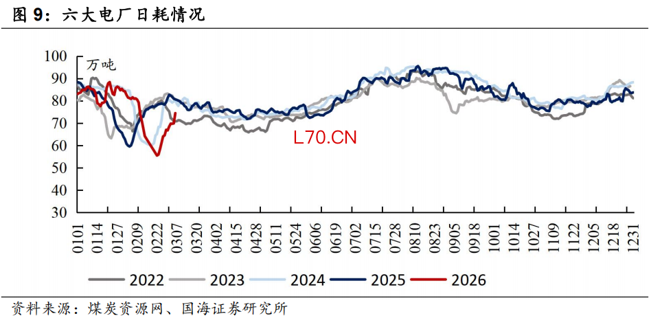 本周六大电厂日耗环比上升:截至3月6日,六大电厂日耗为74.5万吨,周环比上升9.9万吨。