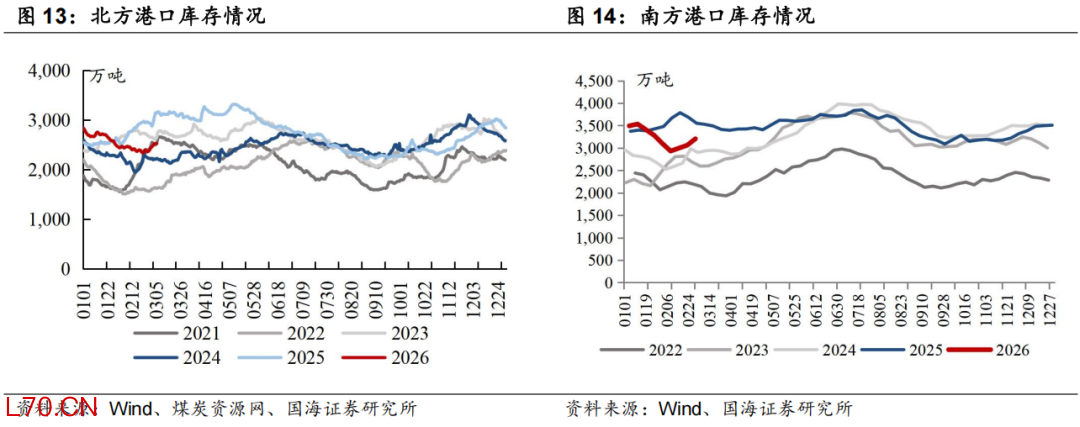 本周北方港口库存环比上升:截至3月5日,北方港口库存为2524.8万吨,周环比上升156.1万吨。截至3月2日,南方主流港口库存为3204.7万吨,周环比上升143.4万吨。