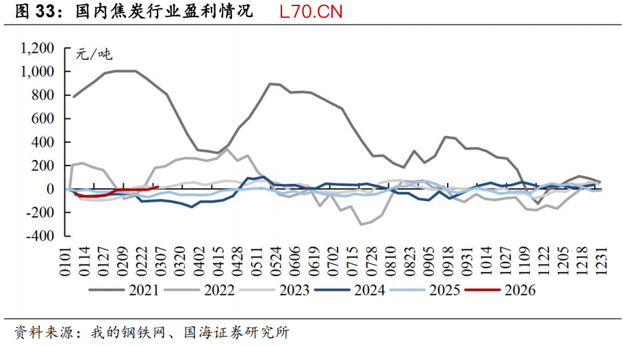 本周国内焦炭行业盈利环比上升:截至3月5日,全国平均吨焦盈利约为17元/吨,周环比上升24元/吨。