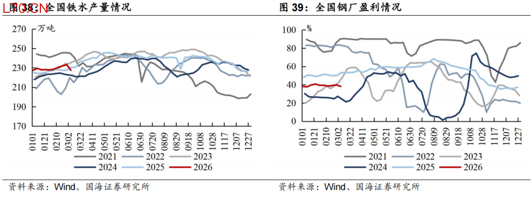 本周全国钢厂盈利率环比下降:截至3月6日,全国钢厂盈利率(247家)为38.12%,周环比下降1.70pct。
