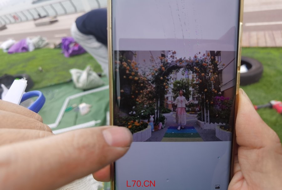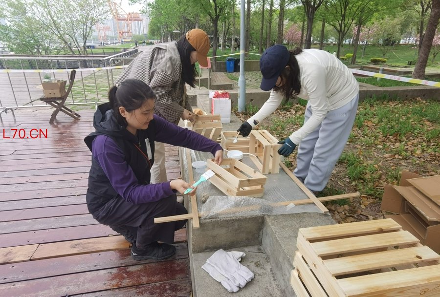 钱佳玄团队给花箱上漆。 陈玺撼摄