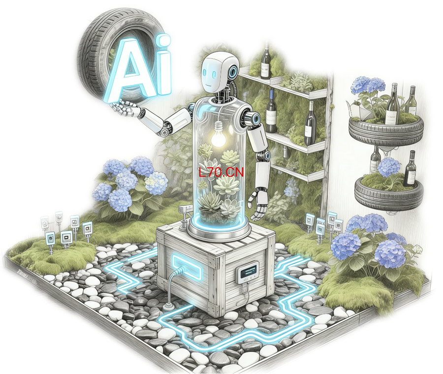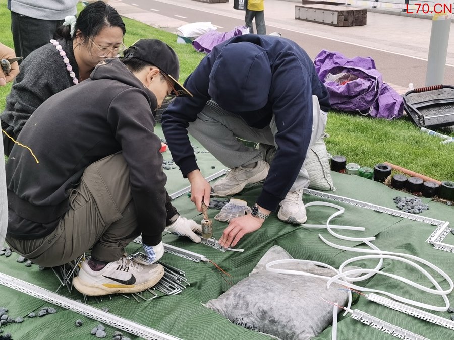 张子龙团队给花园铺设底部灯带,花园使用了大量可循环物,例如啤酒玻璃瓶做的栅栏、旧轮胎做的花凳。 陈玺撼摄