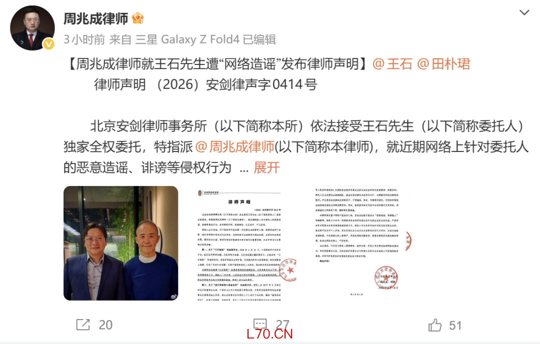 【导读】王石方发布律师声明,宣布启动法律追责程序