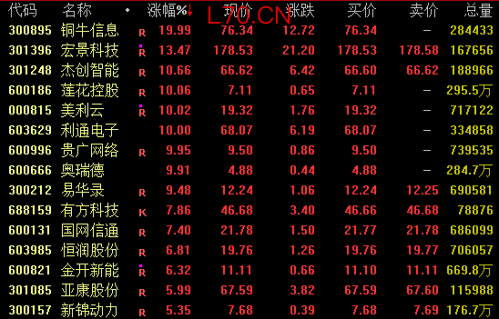 元股证券:ygzq.hk算力概念盘中再度活跃,截至收盘,铜牛信息涨20%创历史新高,宏景科技涨超13%,盘中涨超18%再创新高,杰创智能涨超10%,美利云、利通电子等均涨停。