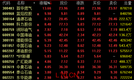 石油板块盘中强势拉升,截至收盘,首华燃气涨近14%,蓝焰控股涨停,通源石油、科力股份涨超8%,中国海油、中国石油均涨超5%。
