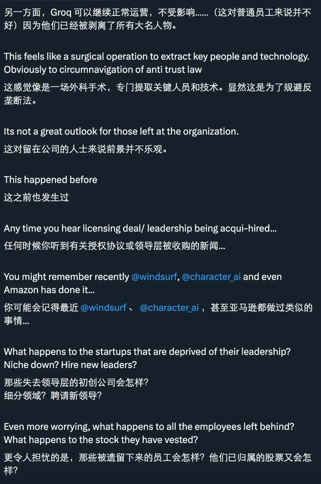 值得注意的是,交易还设置了特别保护条款:无论去留,任职不满一年的 Groq 员工将被免除股权归属的「悬崖期」限制,确保其能够获得一定的即时流动性。