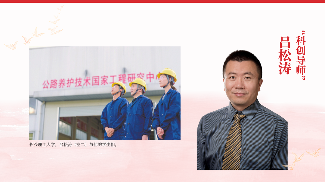 长沙理工大学交通学院副院长、博士生导师吕松涛,心怀“国之大者”,致力于攻克极端环境下长寿命道路工程关键技术,其研究成果有效破解了青藏高原等高寒地区道路寿命短、维护难的世界性难题,推广应用于京港澳高速等重点工程,获国家科技进步二等奖、中国公路学会科学技术特等奖等重大奖励。他坚持“科研带教学、项目育英才”,长期担任班主任和科创导师,带领学生深入高原一线,将国家重大需求转化为生动课堂,指导学生多次获“挑战杯”“金种子杯”等省级以上创业大赛金奖。