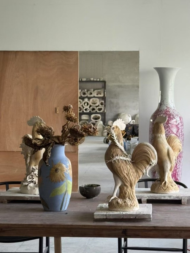 这个公鸡的素坯还没烧,这个公鸡的模具是一个老的模具,它是我和当地的一位师娘一起合作的。公鸡也是法国的象征,这件作品就像是法中文化碰撞的产物。